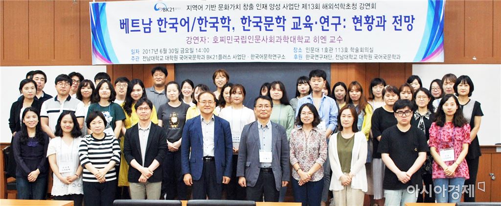 [아시아경제 노해섭 기자]전남대학교 BK21플러스 지역어 기반 문화가치 창출 인재양성 사업단(단장 신해진·국어국문학과 교수, 이하 ‘사업단’)이 베트남과의 학술교류를 강화하고 나섰다.사업단은 지난 6월 30일 베트남 호찌민국립인문사회과학대학의 히엔(Nguyen Thi Hien) 교수를 초청, 제13회 해외석학 초청 강연회를 연 데 이어 호찌민국립인문사회과학대학과 학술교류협정(MOU) 체결을 추진중이다.히엔 교수는 이날 ‘베트남에서 한국어/한국학, 한국문학 교육 연구의 현황과 전망’이란 주제의 강연을 통해 베트남에서 진행하고 있는 한국어/한국학, 한국문학 교육 연구 현황을 시기적으로 세분화해 살폈다. 또한, 한국과 베트남 간의 문화적·학술적 교류 증진을 위한 교육 및 연구에서의 발전 방향을 제안했다. 강연 이후에는 베트남 소재 대학에서의 한국어/한국학, 한국 문학 교육 연구의 현실에 대해 사업단 참여대학원생들의 심도 있고 열띤 질의응답이 이어졌다.히엔 교수는 호찌민국립인문사회과학대학교 동방학부 한국학과를 졸업한 뒤, 서울대학교 국어국문학과에서 석사 및 박사학위를 취득했다. 한국경찰대학교, 한국국제협력재단, 한국외국어대학교에서 베트남어 교육 및 연구를 수행했으며, 현재 호찌민국립인문사회과학대학교 한국학부 부학과장으로 재직중이다. 또한 ‘코리아나’베트남어판의 편집장을 맡고 있으며, 다수의 저서와 논문을 통해 베트남에서 한국어·한국학·한국문학을 알리는 데 앞장서오고 있는 한국학 전문가이다.사업단은 이번 초청 강연을 시작으로 베트남 호찌민국립인문사회과학대학교 한국학부와 학술교류협정(MOU)을 체결하기로 하고, 오는 7월 26일~29일 관련 연수를 가질 예정이다. 사업단은 이를 통해 베트남의 한국학과 지역어 연구에 관한 현황을 파악하고, 국제 지역어학 연구 및 다각적인 해외 공동연구의 토대를 구축하는 등 한국·베트남 간 문화적·학술적 교류를 강화해나기로 했다.사업단은 앞으로도 참여대학원생들의 국제적 마인드 함양을 위해 지속적으로 해외석학 초청 강연 및 학술교류협정을 추진할 계획이다.노해섭 기자 nogary@<ⓒ세계를 보는 창 경제를 보는 눈, 아시아경제(www.asiae.co.kr) 무단전재 배포금지>