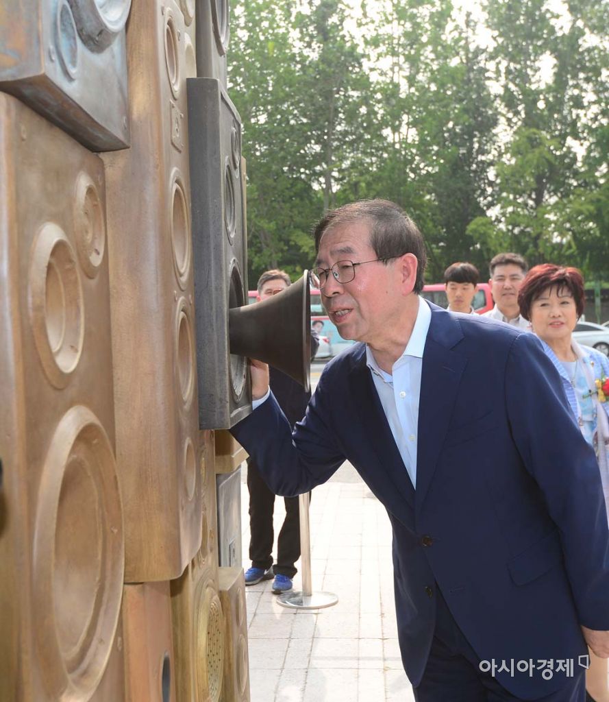 [아시아경제 백소아 기자] 5일 서울 중구 서울광장에서 열린 공공프로젝트 오늘 제막식에서 박원순 서울시장이 직접 시민의 목소리에 자신의 목소리를 녹음하고 있다. 스피커 200여 개를 쌓은 모양의 5.2m 높이인 '시민의 목소리'는 작품 앞에 마이크를 설치해 시민이 목소리를 녹음하면 배경 소리와 섞여 탑 안에 설치된 스피커로 흘러나온다.백소아 기자 sharp2046@asiae.co.kr<ⓒ세계를 보는 창 경제를 보는 눈, 아시아경제(www.asiae.co.kr) 무단전재 배포금지>