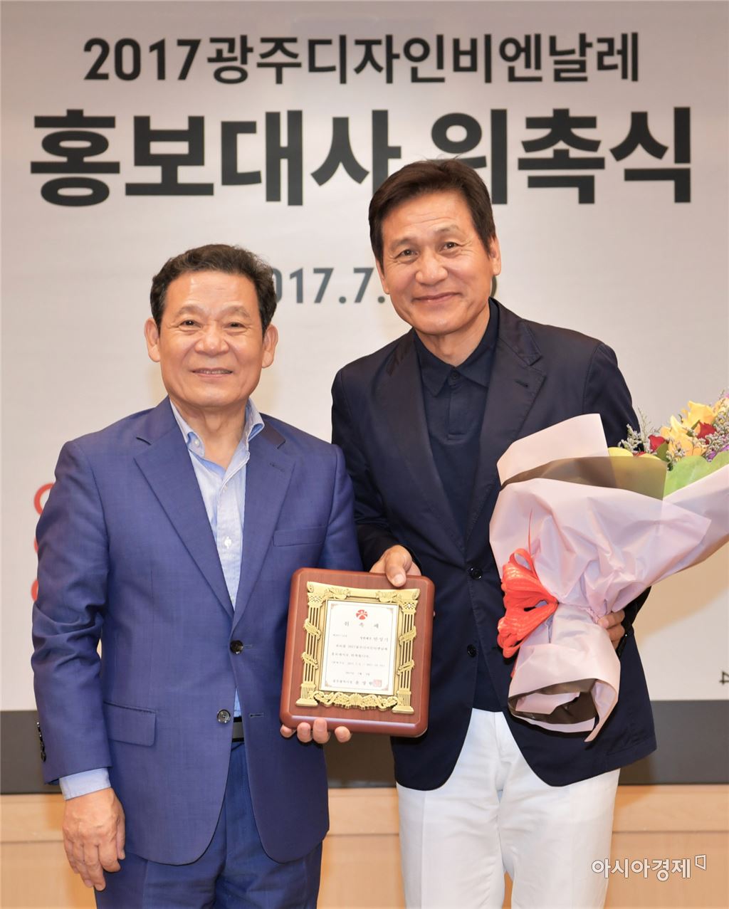윤장현 광주광역시장이 5일 오후 시청 비즈니스룸에서 열린 '2017 광주디자인비엔날레 명예홍보대사 위촉식'에 참석해 배우 안성기씨에게 위촉패를 전달한 뒤 기념촬영을 하고 있다.<br /> <br /> <br />