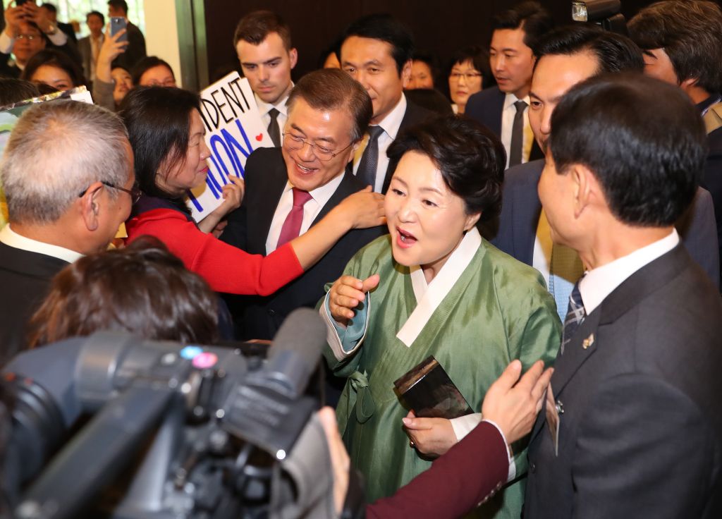 문재인 대통령과 부인 김정숙 여사가 5일(현지시간) 독일 베를린 하얏트 호텔에서 열린 동포 오찬 간담회에 참석해 교민들의 열렬한 환영을 받고 있다. 사진/베를린=연합뉴스
