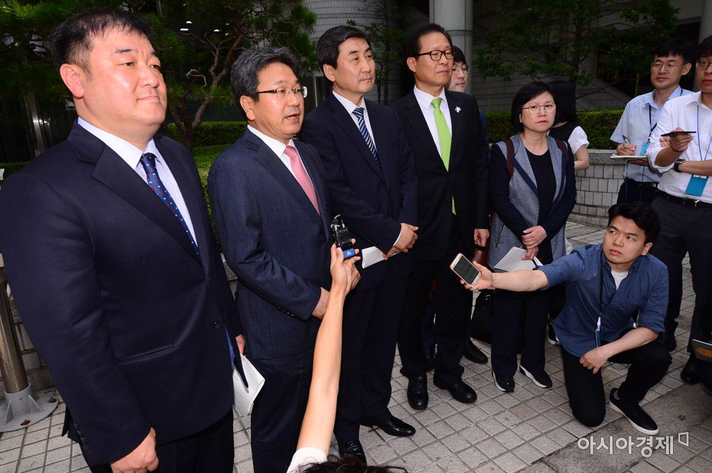 [아시아경제 문호남 기자] 강기정 전 더불어민주당 의원(왼쪽 두 번째), 이종걸 더불어민주당 의원, 문병호 전 국민의당 의원, 김현 전 더불어민주당 의원이 6일 서울 서초구 서울중앙지법에서 열린 '국가정보원 여직원 감금' 관련 폭력행위 등 처벌에 관한 법률상 공동감금 항소심 선고 공판을 마친 뒤 법원 청사 앞에서 입장을 밝히고 있다. 국정원 여직원 감금 사건으로 재판에 넘겨진 이종걸 의원 등 관련자 전원은 2심에서 무죄를 선고받았다.문호남 기자 munonam@asiae.co.kr<ⓒ세계를 보는 창 경제를 보는 눈, 아시아경제(www.asiae.co.kr) 무단전재 배포금지>