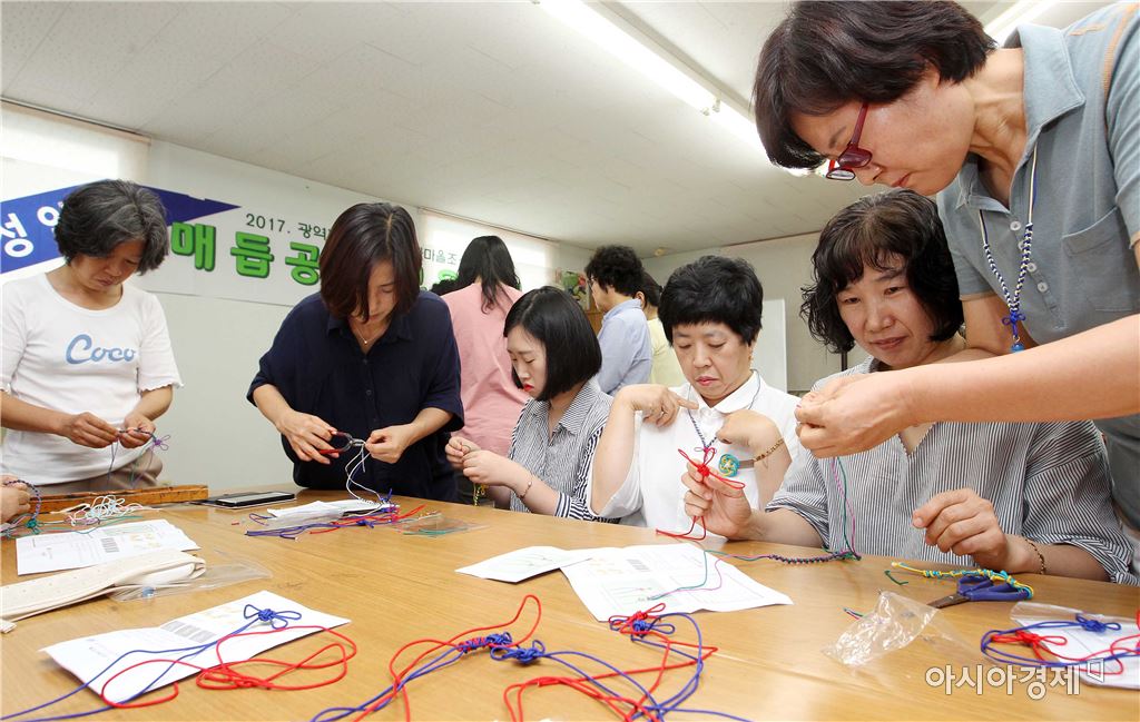 [아시아경제 노해섭 기자]광주 북구는 6일 매곡동 주민센터 3층 주민사랑방에서 주민 20명을 대상으로 '매듭공예' 강좌를 실시했다. '매듭공예' 강좌는 여성친화마을 사업의 일환으로 진행하는 '여성 주도형 일자리 창출 사업'으로 지난 6월 8일부터 7월 11일까지 진행한다.사진제공=광주시 북구<ⓒ세계를 보는 창 경제를 보는 눈, 아시아경제(www.asiae.co.kr) 무단전재 배포금지>