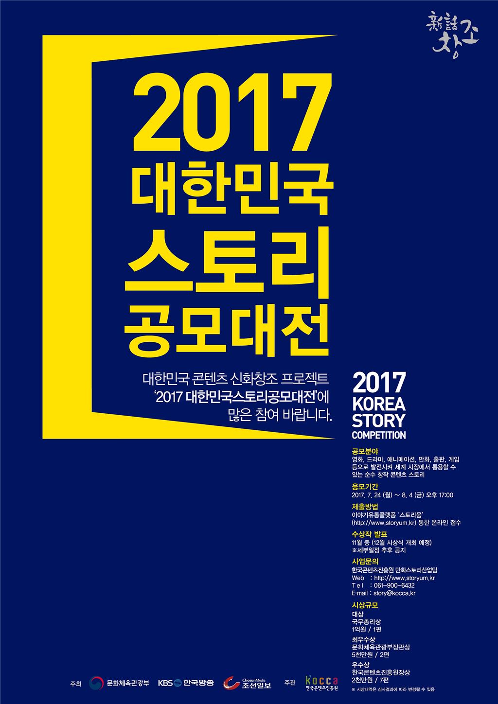 [아시아경제 이종길 기자]문화체육관광부와 한국콘텐츠진흥원은 오는 24일부터 다음 달 4일까지 '2017 대한민국 스토리 공모대전'에 참가할 작품을 모집한다고 6일 밝혔다. 대상은 완결된 시나리오가 아닌 산문 형식의 트리트먼트(시놉시스와 시나리오의 중간단계)다. 작품 개요 한 쪽(이하 A4 기준), 스토리 줄거리 다섯 쪽, 스토리 본문 예순 쪽을 작성해 제출하면 된다. 신인, 기성 작가의 구분 없이 모두 열 편을 뽑을 예정이다. 대상 수상작 한 편에는 국무총리상과 상금 1억원이 수여된다. 최우수상 두 편과 우수상 일곱 편에는 각각 상금 5000만원과 2000만원이 돌아간다. 전문가 컨설팅, 1대1 멘토링, 작품 모니터링, 해외 발표 행사 참가 등의 혜택도 제공해 수상작을 사업화할 수 있도록 도울 방침이다. 자세한 사항은 스토리움이나 한콘진 홈페이지.이종길 기자 leemean@asiae.co.kr<ⓒ세계를 보는 창 경제를 보는 눈, 아시아경제(www.asiae.co.kr) 무단전재 배포금지>