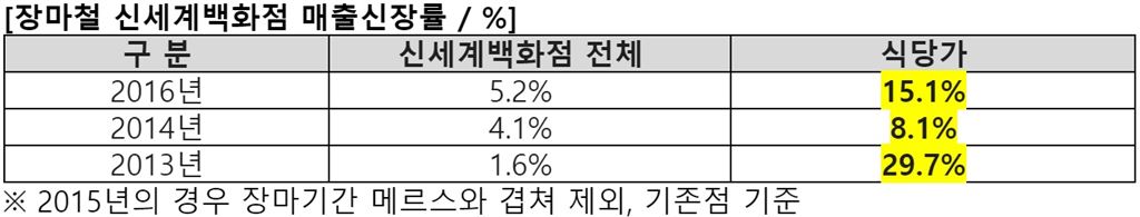 장마는 소비자들의 식사에도 영향을 미치고 있다. 지난달 24일부터 이달 2일 사이 신세계백화점 식당가 매출은 전년 동기 대비 36.5% 신장했다. 올해뿐 아니라 중동호흡기증후군(메르스·MERS)과 장마 기간이 겹친 2015년을 제외한 2013∼2016년 3년간 장마철 식당가 매출 증가율은 백화점 전체 신장률을 훨씬 웃돌았다. 악천후 속 찾기 쉽고 주차도 편리한 백화점 식당가에 소비자들이 몰리는 것으로 풀이된다. 또 비오는 날 막걸리에 파전을 즐기는 이들이 늘며 대형마트에선 막걸리, 부침가루 판매가 늘고 있다. 오종탁 기자 tak@asiae.co.kr<ⓒ세계를 보는 창 경제를 보는 눈, 아시아경제(www.asiae.co.kr) 무단전재 배포금지>