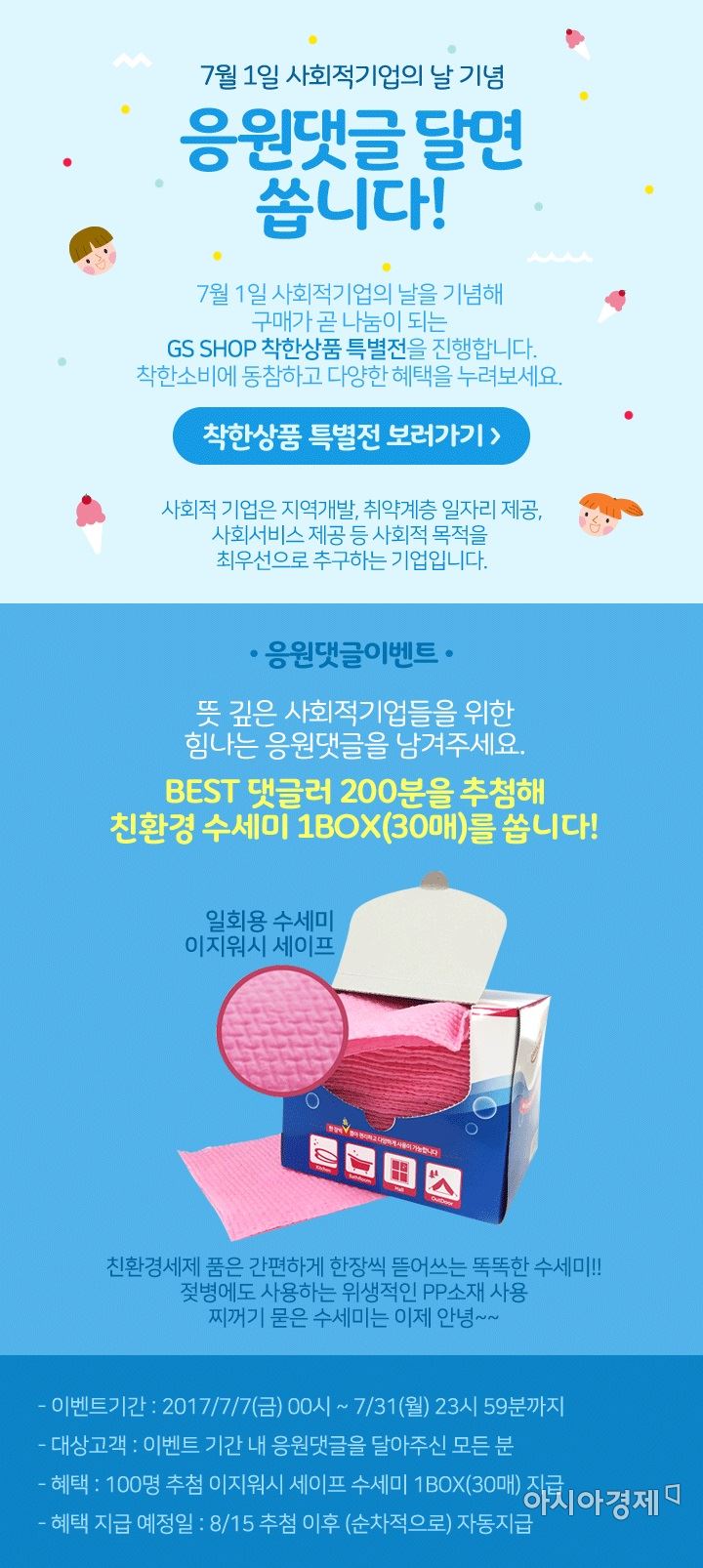 [아시아경제 오종탁 기자] GS샵이 '착한 상품'들을 선보인다.GS샵은 7월 첫째주 '사회적 기업 주간'을 맞아 오는 31일까지 착한 상품 특별전을 진행한다고 7일 밝혔다. GS샵은 사회적 기업의 판로 개척을 돕기 위해 지난 3월 한국사회적기업진흥원, 아름다운가게, 행복나래와 함께 착한 상품 페어를 열었다. 당시 80여명의 전문가로부터 가능성을 인정받은 상품들을 이번 특별전에 입점시켰다. 더불어삶협동조합의 '동락모싯잎송편', 기장사람들의 '기장미역', 어스맨의 '무설탕 건살구·건체리 세트' 등 23개 식품과 블루인더스 '황사마스크', 에코파티메라이 '어닝반지갑' 등 생활주방류 11가지로 총 34가지 상품을 준비했다. 착한 상품 특별전의 모든 상품은 무료 배송된다. 구매 고객 중 300명을 추첨해 친환경 세제가 첨가된 향균 일회용 수세미 '이지워시세이프' 1박스(30매)를 증정한다. 또 GS샵 이벤트 페이지 내 사회적 기업을 응원하는 댓글을 작성한 고객 중 200명을 추첨, 이지워시세이프 1박스를 증정하는 이벤트도 연다. GS샵은 2010년부터 도네이션 방송 '따뜻한 세상 만들기'를 통해 장애인재활단체, 친환경기업, 공정무역단체 등에서 생산하고 판매 수익이 사회적 공익으로 이어지는 사회적 기업 상품을 판매하고 있다. 앞으로는 사회적 기업에 대한 판로 지원을 TV 방송뿐 아니라 온라인, 모바일에서도 지속할 계획이다. 오종탁 기자 tak@asiae.co.kr<ⓒ세계를 보는 창 경제를 보는 눈, 아시아경제(www.asiae.co.kr) 무단전재 배포금지>