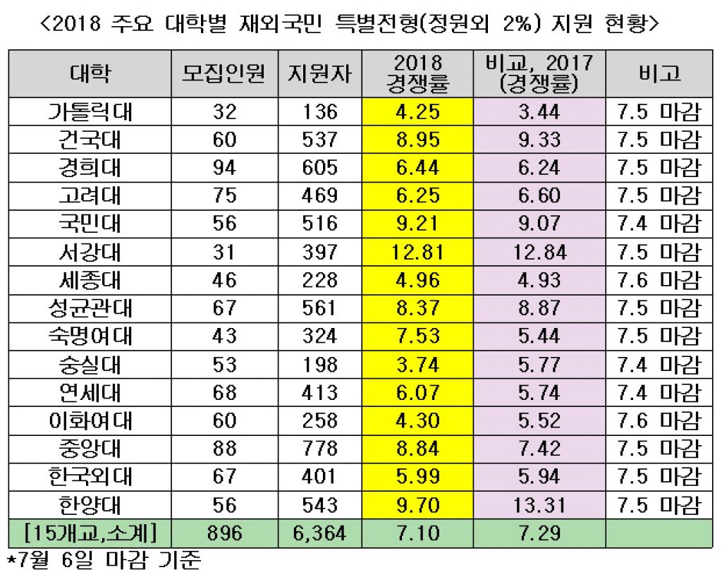 [아시아경제 조인경 기자] 서울 주요 15개 대학의 재외국민 특별전형(정원외 2%) 경쟁률이 지난해보다 소폭 하락했다. 반면 외국에서 초·중·등 과정을 모두 마쳐야 하는 '초·중·고 전 교육과정 해외이수자 전형'는 지원자가 크게 늘어났다.8일 종로학원하늘교육에 따르면 고려대, 연세대, 성균관대 등 15개 대학이 지난 6일까지 마감한 재외국민 특별전형 지원원서 접수 결과, 896명을 선발하는 중·고교 과정 해외이수자 전형에 6364명이 지원한 것으로 나타났다. 경쟁률은 7.10대 1로 지난해 7.29대 1보다 소폭 낮아졌다. 대학별로는 서강대의 경쟁률이 12.81대 1로 가장 높았고 이어 한양대 9.70대 1, 국민대 9.21대 1, 건국대 8.95대 1 등의 순이었다. 특히 올해는 건국대와 고려대(6.25대 1), 서강대, 성균관대(8.37대 1), 숭실대(3.74대 1), 이화여대(4.30대 1), 한양대 등이 지난해와 비교해 경쟁률이 떨어졌다.일명 '3년 특례' 전형이라 불리는 중·고교 과정 해외이수자 전형은 고등학교 1년을 포함해 중·고교과정 중 3년 이상의 과정을 외국에서 이수한 학생을 선발한다. 2018학년도에는 정원외 2% 모집을 기준으로 전국 4년제 대학 가운데 연세대와 고려대, 성균관대, 한양대 등 133개교(캠퍼스는 본교에 포함하여 산출)에서 모두 4519명을 선발한다. 반면 모집인원 제한이 없는 초·중·고 전 교육과정 해외이수자, 일명 '12년 특례' 전형의 경우 가톨릭대와 건국대, 경희대, 국민대, 서강대, 성균관대, 숙명여대, 연세대, 이화여대, 중앙대, 한양대 11개에 모두 3214명이 지원했다. 지난해 2841명보다 13.1%(373명) 증가한 규모다.대학별로는 연세대가 634명(전년도 576명·58명 증가)으로 가장 많았고, 성균관대 610명(520명·90명 증가), 중앙대 487명(396명·91명 증가), 한양대 467명(428명·39명 증가), 경희대 307명(237명·70명 증가), 서강대 283명(281명·2명 증가) 등이었다.이처럼 12년 특례 전형 지원자 수가 증가한 것은 3년 특례 전형과는 달리 모집인원의 제한이 없어 합격 가능성이 큰 데다 이전보다 초중고 전 과정을 해외에서 이수한 학생들의 수가 늘어났기 때문으로 풀이된다.이들 재외국민 특별전형은 동일 학년도를 기준으로 수시모집에 6회까지만 지원이 가능하다. 재외국민과 외국인(2% 이내), 북한이탈주민 전형은 대학교육협의회가 2018학년도 대입 전형 일정으로 공지한 수시 및 정시 전형 일정에 따르지만, 부모 모두 외국인인 외국인, 전 교육과정 이수자 모집은 대학 자율로 실시한다. 재외국민 2% 이내(중·고교 과정 해외 이수) 전형과 새터민 전형 등은 대체로 1단계 서류평가, 2단계는 면접 또는 필답고사를 실시해 최종 합격자를 선발한다.조인경 기자 ikjo@asiae.co.kr<ⓒ세계를 보는 창 경제를 보는 눈, 아시아경제(www.asiae.co.kr) 무단전재 배포금지>