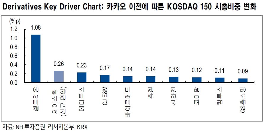 [아시아경제 박미주 기자]오는 10일 카카오의 유가증권 이전 상장으로 코스닥150 내 시가총액 비중에 변동이 있을 것으로 전망된다. 특히 셀트리온과 제이스텍의 움직임을 주시할 필요가 있다는 분석이다.8일 NH투자증권에 따르면 카카오 이전 이후 코스닥150 내 셀트리온의 시가총액 비중은 1.08%포인트 늘어날 것으로 예상된다. 새로 편입되는 제이스텍은 0.26%포인트 늘어날 것으로 추정된다. 이어 메디톡스(0.26%포인트), CJ E&M(0.17%포인트), 바이로메드·휴젤(0.14%포인트), 신라젠(0.13%포인트), 코미팜(0.12%포인트), 컴투스(0.11%포인트), GS홈쇼핑(0.09%포인트) 등의 순으로 시가총액 비중이 늘어날 것으로 예측된다.최창규 NH투자증권 연구원은 "카카오의 코스닥150 이탈은 상당한 리밸런싱을 동반할 것"이라며 "참고로 코스닥150을 추종하는 자금은 대략 7000억원 가량"이라고 전했다.최 연구원은 "1%포인트 이상 비중이 늘어나는 셀트리온과 신규 편입종목인 제이스텍의 관련 움직임을 주시해야 할 것"이라고 짚었다.박미주 기자 beyond@asiae.co.kr<ⓒ세계를 보는 창 경제를 보는 눈, 아시아경제(www.asiae.co.kr) 무단전재 배포금지>