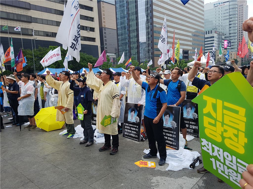 참가자들은 최저임금 인상을 촉구했다. 가장 먼저 발언에 나선 최종진 민주노총 위원장 직무대행은 “노동자민중 삶을 바꾸는 최저임금 1만원을 당장 실현하라고 다시 요구한다”며 “이는 의지의 문제이지 다른 핑계는 있을 수 없다”고 말했다.이가현 만원행동 공동대표도 무대에 올라 “본사 대기업이 책임진다면 최저임금 1만원 가능하다. 최저임금 1만원은 인권이다”라고 말했다. 이 공동대표는 또 “아르바이트생에게 최저임금은 곧 최고임금이다. 그래서 최저임금을 1만원으로 올리는 문제는 우리에게 더욱 절실하다”고 호소했다.내년도 최저임금을 심의하는 최저임금위원회는 법정시한인 지난달 29일을 넘겨 회의를 이어가고 있다. 노동계는 당장 내년부터 시급 1만원을 주장하고 있고, 경영계는 155원 인상을 고수하고 있어 협상이 난항을 겪고 있다. 늦어도 오는 16일까지는 내년도 최저임금 수준을 결정해야 한다.고(故) 백남기 농민 책임자 처벌도 요구했다. 김영호 전국농민회총연맹 의장은 “새 정부 들어선 후에야 서울대병원은 병사에서 외인사로 사인을 정정하고 경찰은 국회 요구에도 제출 안 하던 사건당일 청문감사보고서를 법원에 제출했다”며 “600여일 만에 사건 실체가 하나씩 밝혀지고 바로잡혀가는 것은 유가족과 민중이 싸웠기 때문이지만 사건의 완전 해결까지는 험난한 과정 남아 있다. 백 농민을 죽음에 이르게 한 모든 책임자들 단 한명도 처벌받지 않았다”고 말했다.고고도미사일방어체계(THAAD·사드) 배치 철회를 주장하는 발언도 이어졌다. 박석운 한국진보연대 상임대표는 “사드는 일본이나 미국 방어에는 혹시 도움이 될지 모르지만 한국 민중들은 불구덩이에 들어가는 것”이라며 “사드배치는 동북아의 군사 긴장과 갈등을 조장하는 평화 파괴적 시스템이다”라고 주장했다. 박 상임대표는 한미 자유무역협정(FTA)도 재협상해 폐기시키자고 했다.이밖에도 ▲노점상 고 박단순 진상규명 및 책임자 처벌 ▲한상균 민주노총 위원장 석방 등의 요구도 나왔다.참가자들은 오후 5시 35분쯤 집회를 마치고 도심 행진에 나섰다. 이들은 주한미국 대사관을 지나 안국역, 조계사와 종로1가를 거쳐 광화문광장으로 돌아오는 코스로 행진했다. 행진 중 미 대사관 앞에서 “사드배치 철회하라” “전쟁무기 반대한다” “우리에게 평화를” 등의 구호를 외쳤다.또 백 농민이 사망한 장소인 르메이에르빌딩 앞에서 잠시 멈춰 묵념과 ‘임을 위한 행진곡’을 제창하며 고인을 추모했다. 이날 집회는 행진을 포함해 2시간여 동안 짧게 진행된 뒤 끝났다.한편 경찰은 만일을 대비해 48개 중대 3480명의 병력을 투입해 이날 집회를 관리했다.김민영 기자 mykim@asiae.co.kr정준영 기자 labrie@asiae.co.kr<ⓒ세계를 보는 창 경제를 보는 눈, 아시아경제(www.asiae.co.kr) 무단전재 배포금지>