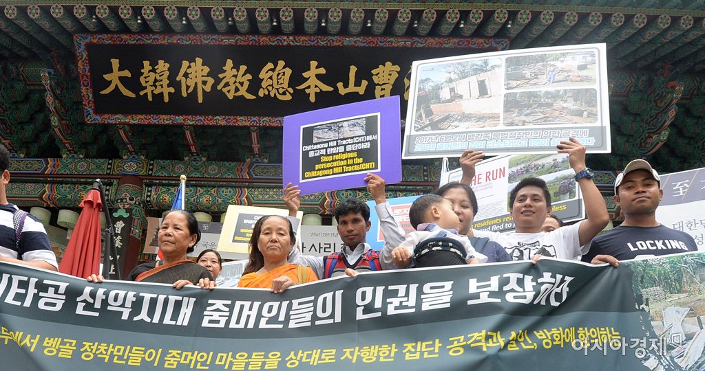 [아시아경제 문호남 기자] 재한줌머인연대 및 국제민주연대 관계자들이 9일 서울 종로구 조계사 앞에서 '방글라데시 줌머족의 평화보장 촉구' 기자회견을 열고 있다. 줌머족은 방글라데시 동남부 '치타공 지역 산악지대'에 살고 있는 11개 소수민족을 통칭한다. 줌머족은 "방글라데시 정부로부터 줌머족 말살정책 등 인권 탄압 문제를 겪고 있다"며 이에 대한 불교계의 관심을 촉구했다.문호남 기자 munonam@asiae.co.kr<ⓒ세계를 보는 창 경제를 보는 눈, 아시아경제(www.asiae.co.kr) 무단전재 배포금지>
