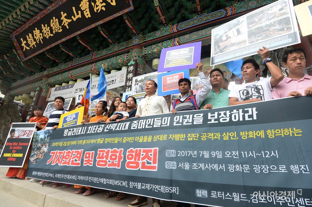 [아시아경제 문호남 기자] 재한줌머인연대 및 국제민주연대 관계자들이 9일 서울 종로구 조계사 앞에서 '방글라데시 줌머족의 평화보장 촉구' 기자회견을 열고 있다. 줌머족은 방글라데시 동남부 '치타공 지역 산악지대'에 살고 있는 11개 소수민족을 통칭한다. 줌머족은 "방글라데시 정부로부터 줌머족 말살정책 등 인권 탄압 문제를 겪고 있다"며 이에 대한 불교계의 관심을 촉구했다.문호남 기자 munonam@asiae.co.kr<ⓒ세계를 보는 창 경제를 보는 눈, 아시아경제(www.asiae.co.kr) 무단전재 배포금지>