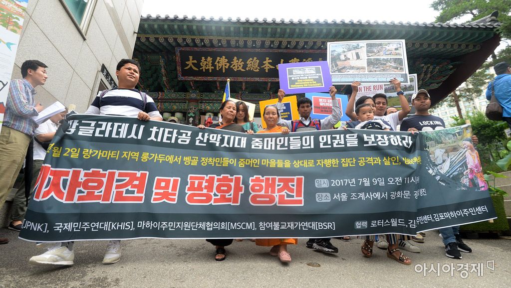 [아시아경제 문호남 기자] 재한줌머인연대 및 국제민주연대 관계자들이 9일 서울 종로구 조계사 앞에서 '방글라데시 줌머족의 평화보장 촉구' 기자회견을 열고 광화문광장 방향으로 행진을 하고 있다. 줌머족은 방글라데시 동남부 '치타공 지역 산악지대'에 살고 있는 11개 소수민족을 통칭한다. 줌머족은 "방글라데시 정부로부터 줌머족 말살정책 등 인권 탄압 문제를 겪고 있다"며 이에 대한 불교계의 관심을 촉구했다.문호남 기자 munonam@asiae.co.kr<ⓒ세계를 보는 창 경제를 보는 눈, 아시아경제(www.asiae.co.kr) 무단전재 배포금지>