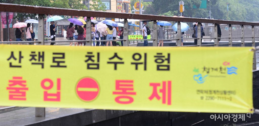 [아시아경제 문호남 기자] 장마전선의 영향을 받아 전국이 대체로 흐리고 비가 내린 9일 서울 종로구 청계천에 '산책로 침수 위험 출입통제' 안내문이 설치돼 있다.문호남 기자 munonam@asiae.co.kr<ⓒ세계를 보는 창 경제를 보는 눈, 아시아경제(www.asiae.co.kr) 무단전재 배포금지>