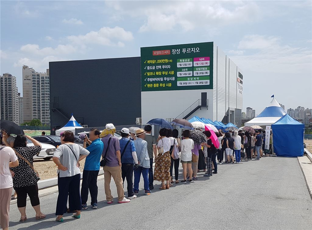 지난 7일 문을 연 '로열파크 씨티 장성 푸르지오' 견본주택에 입장하기 위해 방문객들이 줄을 서 기다리고 있다. 이 견본주택에는 사흘 동안 1만8000명이 방문했다.