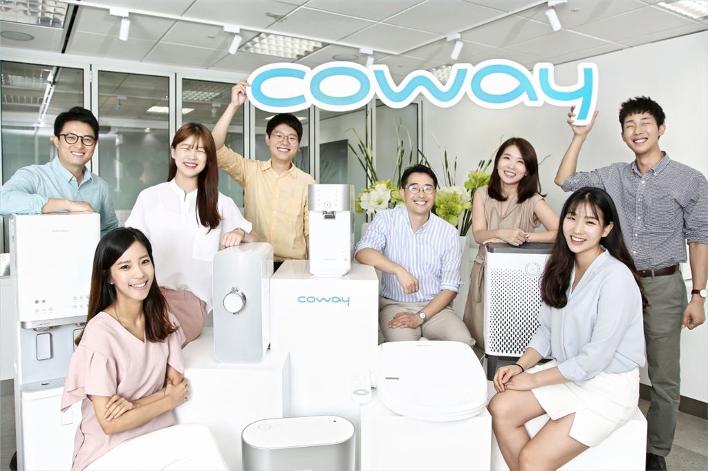 코웨이 직원들이 정수기 등 혁신제품들과 함께 기념촬영을 하고 있다.
