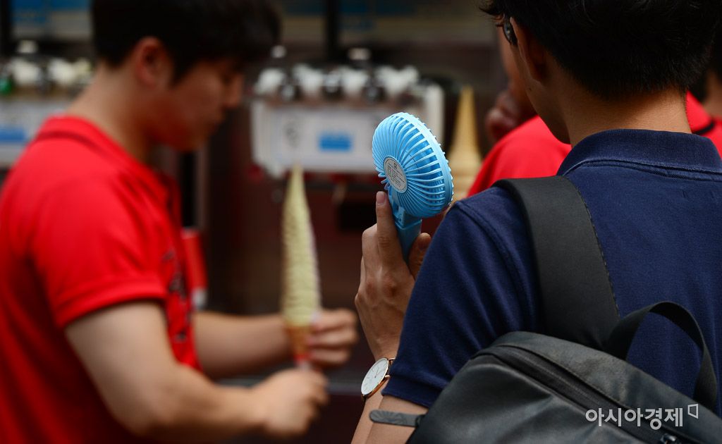 [아시아경제 문호남 기자] 장마가 소강상태를 보이며 전국에 폭염특보가 내린 11일 서울 중구 명동쇼핑거리에서 한 관광객이 휴대용 선풍기 바람을 쐬며 아이스크림을 기다리고 있다.문호남 기자 munonam@asiae.co.kr<ⓒ세계를 보는 창 경제를 보는 눈, 아시아경제(www.asiae.co.kr) 무단전재 배포금지>