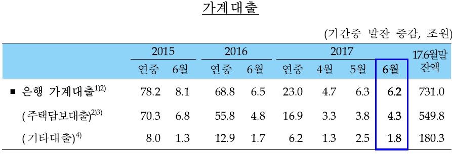 [아시아경제 조은임 기자]6월 한 달 간 주택담보대출이 4조3000억원 늘어난 것으로 나타났다. 6·19부동산대책이 시행되기 직전 아파트 거래가 급증하면서 대출수요도 몰린 것으로 풀이된다. 한국은행이 12일 발표한 '2017년 6월중 금융시장동향'에 따르면 6월중 은행 가계대출(정책모기지론 포함) 잔액은 전월대비 6조2000억원 증가한 731조원으로 집행됐다. 지난 5월(6조3000억원)에 이어 큰 폭의 증가세를 이어가고 있는 모습이다. 주택담보대출 잔액은 549조8000억원으로 한 달 간 4조3000억원 증가했다. 대출 규제를 강화환 6·19부동산 대책이 시행을 앞두고 아파트 거래가 급증한 데 따른 것이다. 6월 서울아파트매매거래량은 1만5000호로 전달에 비해 5000호 증가했다. 주택담보대출은 지난해 11·3대책이 단행되기 직전인 11월에 6조1000억원이 집행된 이후 최대 증가폭이다. 심교언 건국대 부동산학과 교수는 "6·19대책이 시행되기 직전 아파트 매매거래가 집중이 된데다 지난 1~2년간 분양된 주택의 잔금대출이 주택담보대출로 전환되는 수요도 꾸준히 증가하고 있는 추세"라고 설명했다. 일반신용 대출, 마이너스통장 대출 등을 포함한 기타대출은 1조8000억원 증가해 전달(2조5000억원)보다 수요가 줄었다. 6월 은행 기업대출은 지난달 1조2000억원 줄어든 763조9000억원으로 집계됐다. 분기말 기업의 부채비율 관리를 위한 차입금 일시상환과 은행의 부실채권 매·상각으로 대기업 대출의 감소폭이 7000억원에서 3조원으로 확대된 영향이 크다. 중소기업대출 증가폭도 2조8000억원으로 1조70000억원으로 줄었다. 반면 개인사업자 대출은 한 달 간 2조5000억원 급증했다. 이는 2015년 10월(2조9000억원) 이후 약 2년 만에 최대 증가폭이다. 주택 임대사업자들 위주로 대출 수요가 증가했다는 게 한은의 설명이다. 회사채 순발행 규모는 전월대비 5000억원 증가했다. 기업실적 개선 등에 따른 심리 개선으로 순발행 기조를 유지했다. 기업어음(CP)은 기업의 분기말 일시상환으로 6000억원 순상환됐다. 6월 은행 수신은 26조1000억원 늘면서 1500조6000억원을 기록했다. 반기말을 앞두고 정부 재정지출이 확대되면서 수시입출금예금이 기업을 중심으로 23조5000억원 증가한 영향이 컸다. 또 정기예금과 양도성예금증서(CD)도 일부 은행들이 유동성 비율 제고에 나서면서 각각 1조3000억원, 1조8000억원 늘었다. 반면 자산운용사의 수신은 9조4000억원 감소한 493조7000억원으로 집계됐다. 특히 머니마켓펀드(MMF)는 은행들이 반기말 국제결제은행(BIS) 관리를 위해 자금을 인출하고, 정부도 재정지출을 위한 국고여유자금 회수를 진행하면서 16조7000억원 줄었다. 조은임 기자 goodnim@asiae.co.kr<ⓒ세계를 보는 창 경제를 보는 눈, 아시아경제(www.asiae.co.kr) 무단전재 배포금지>
