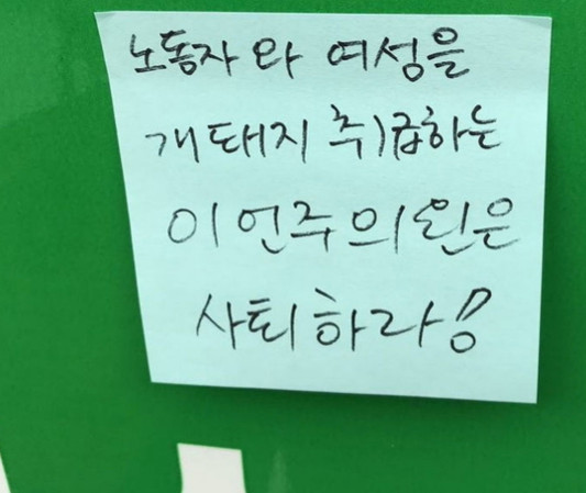 이언주 국민의당 원내수석부대표가 노동자 비하 발언을 해 논란에 휩싸인 가운데 이 수석부대표의 지역구인 경기도 광명시의 주민들도 해당 논란에 비난하고 나섰다. 한 온라인 커뮤니티에 올라온 이 수석부대표의 지역구 사무실에는 "노동자와 여성을 개돼지 취급하는 이언주 의원은 사퇴하라"는 항의문이 붙어있다. 또 다른 항의문에는 "국민 세금으로 먹고 사는 사람이 국민을 하찮게 보다니…하찮은 국민 세금 말고 뱃지 반납하고 깨끗하게 당신이 벌어 쓰라"며 "더이상 광명을 욕되게 하지 말라"며 목소리를 높였다.[사진 온라인 커뮤니티 캡처]<br />