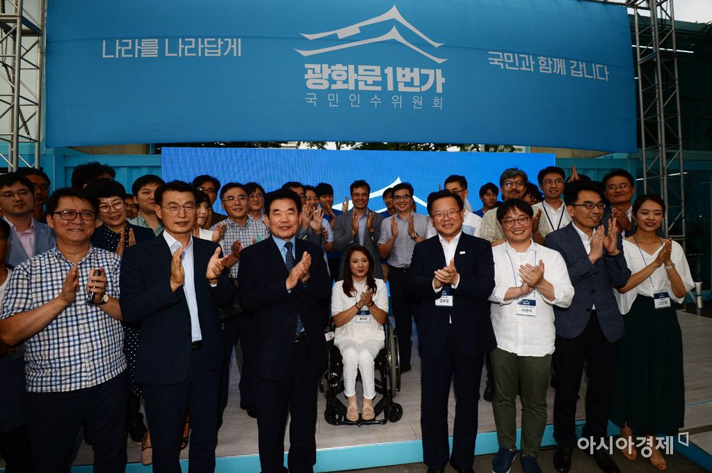 [아시아경제 문호남 기자] 국정기획자문위원회 내 국민참여기구인 국민인수위원회의 '광화문 1번가' 오프라인 창구의 운영 종료일인 12일 서울 종로구 광화문 1번가에서 열린 해단식에서 김진표 국정기획자문위원장(왼쪽 세 번째), 홍서윤 소통위원, 김부겸 행정차지부 장관, 서천석 소통위원, 하승창 청와대 사회혁신수석, 고민정 청와대 부대변인 등 참석자들이 박수를 치고 있다.문호남 기자 munonam@asiae.co.kr<ⓒ세계를 보는 창 경제를 보는 눈, 아시아경제(www.asiae.co.kr) 무단전재 배포금지>