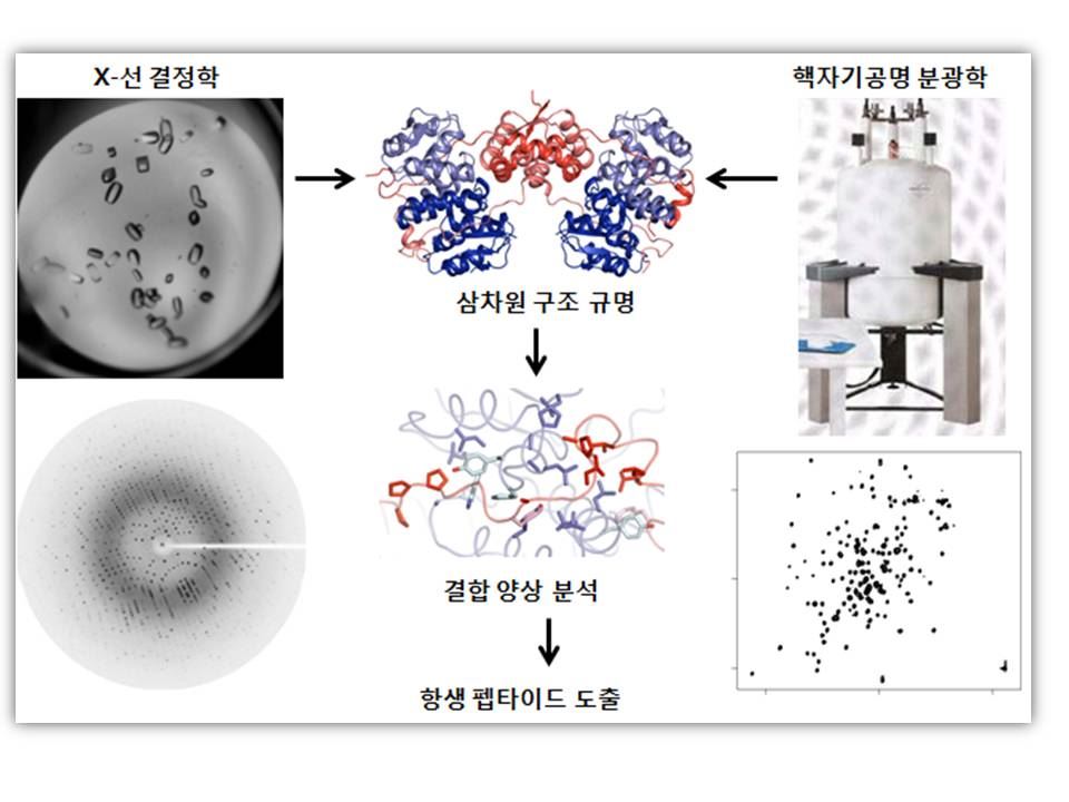 ▲X-선 결정학과 핵자기공명 분광학을 토대로 한 신약 개발 과정.[사진제공=한국연구재단]<br />