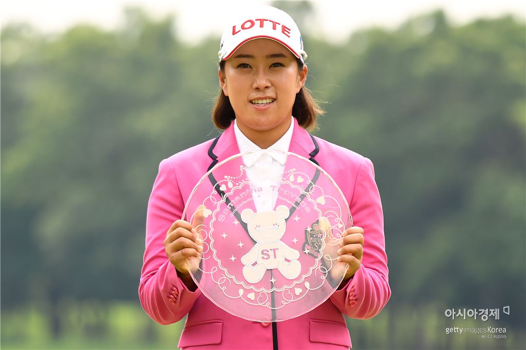 김해림이 사만사타바사 최종일 우승 직후 트로피를 들고 포즈를 취하고 있다. 이바라키(일본)=Getty images/멀티비츠