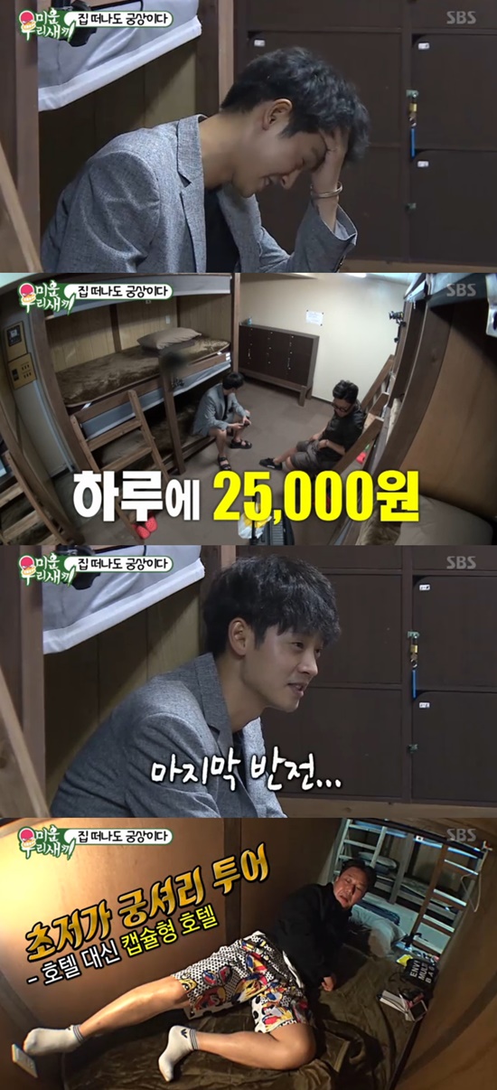 '미운우리새끼' 정준영이 이상민이 예약한 숙소를 보고 충격을 받았다.16일 방송된 SBS '미운우리새끼'에서는 궁셔리 초저가로 일본 후쿠오카 여행을 떠난 정준영과 이상민의 모습이 그려졌다. 이날 이상민과 정준영은 미리 예약한 숙소에 들어갔다. 정준영은 숙소 입구에 들어가자마자 웃음을 터트렸다. 알고 보니 독방이 아닌 여러명과 함께 쓰는 캡슐형 호텔이었다.정준영은 "1층, 2층 하길래 2층집인줄 알았더니"라고 말하며 한참을 웃었다. 이어 정준영은 "아 대단하다. 대단해"라며 궁셔리 여행에 감탄을 금치 못했고, 이상민은 "이런데서 자는 것도 추억이다. 일본 호텔은 비싸다. 여기는 2만 5천원이다"고 설명했다. 한편 이상민의 '미운 우리 새끼'에서 남다른 피부 관리 비결과 돈 절약 방법 등 솔직한 일상을 공개해 시청자들로부터 호평을 받고 있다.아시아경제 티잼 박현윤 기자 yoon2127@naver.com<ⓒ세계를 보는 창 경제를 보는 눈, 아시아경제(www.asiae.co.kr) 무단전재 배포금지>