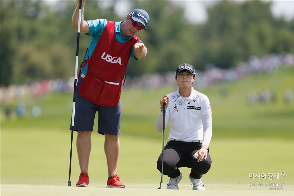 박성현이 US여자오픈 최종일 2번홀에서 캐디 데이비드 존스와 퍼팅 라인을 읽고 있다. 베드민스터(美 뉴저지주)=Getty images/멀티비츠