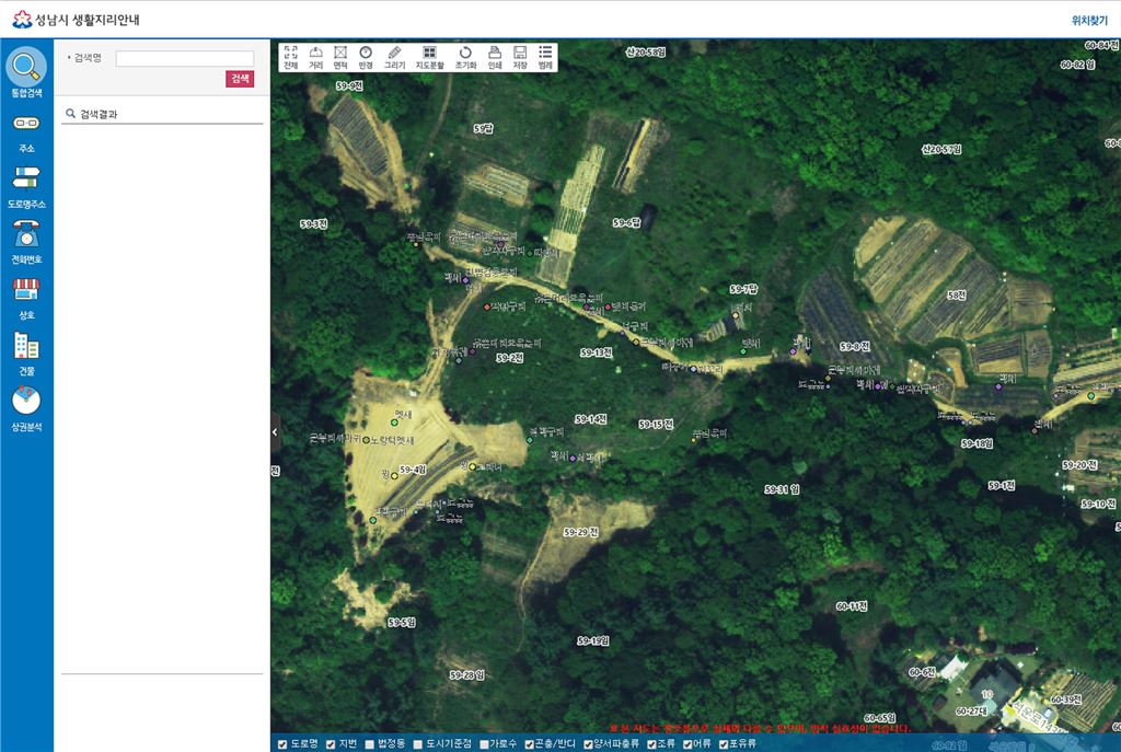 성남시의 도심생태현황 디지털지도에 표시된 동식물 분포도