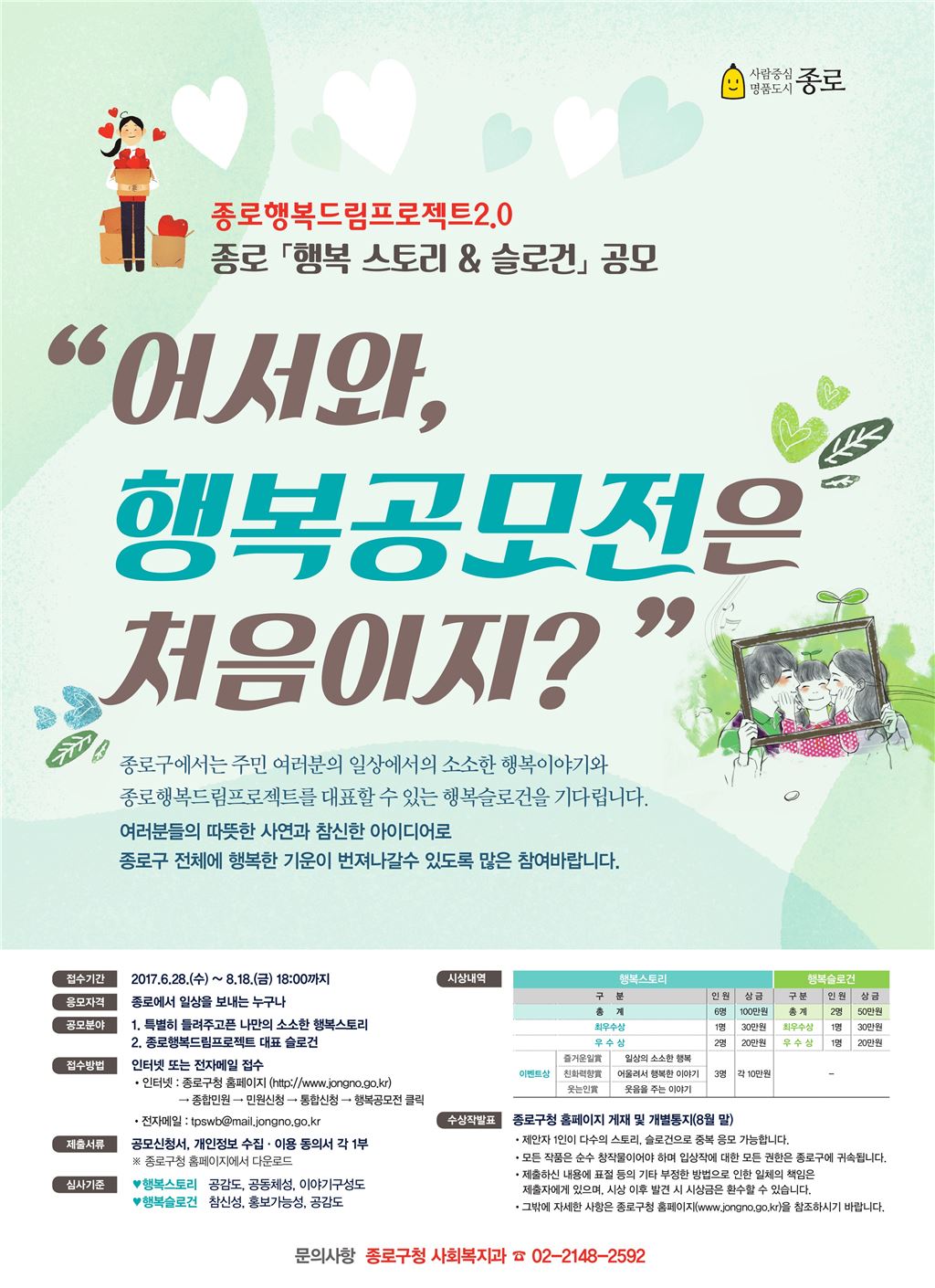 공모 기간은 6월28일부터 8월18일 오후 6시까지이며, 종로에서 일상을 보내는 사람이라면 누구나 참여가능하다. 관심 있는 주민은 종로구 홈페이지(www.jongno.go.kr)에 접속하거나 tpswb@mail.jongno.go.kr로 전자메일을 보내 응모하면 된다. 종로구청사회복지과 행복드림팀(☎2148-2592)으로 문의하면 된다. 제출서류는 ▲공모신청서 ▲공모내용설명서 ▲개인정보 수집·이용 동의서 총 3부이며, 양식은 종로구 홈페이지에서 다운받을 수 있다. 공모전에서 선정되면 상금도 지급한다. 행복스토리 분야는 ▲최우수상 1명 ▲우수상 2명 및 이벤트상으로 ▲즐거운일상 ▲친화력향상 ▲웃는인상 각 1명씩 총 6명을 뽑는다. 행복슬로건 분야는 ▲최우수상 1명 ▲우수상1명으로 총 2명 시상한다. 상금은 분야별로 최대 30만원이다. 결과 발표는 오는 8월 말 홈페이지 공고 및 개별 통보로 이루어진다. 선정된 행복스토리는 종로구 소식지 ‘종로사랑’과 공식 블로그 ‘종로통’등에 게재, 슬로건은 행복드림프로젝트 각종 홍보물 제작 시 이용될 예정이다. 김영종 구청장은 “이번 '종로 행복 스토리 & 슬로건 공모전'을 계기로 주민들이 무수히 많은 일상에서 행복을 찾을 수 있게 되길 바란다”면서 “‘내가 행복하면 주변도 행복하다’는 생각으로 많은 분들이 공모전에 적극 참여해주었으면 좋겠다”고 말했다. 박종일 기자 dream@asiae.co.kr<ⓒ세계를 보는 창 경제를 보는 눈, 아시아경제(www.asiae.co.kr) 무단전재 배포금지>
