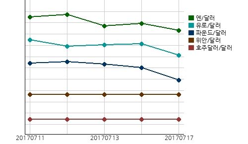 7월 17일 12시 현재 국제시장환율은 달러/유로 환율은 전일대비 0.20%(0.0024달러) 오른 1유로에 1.1469달러이고, 달러/영국 파운드 환율은 전일대비 0.15%(0.0020달러) 오른 1파운드에 1.3096달러이고, 중국 위안/달러 환율은 전일대비 0.03%(0.0021위안) 오른 1달러에 6.7745위안이고, 일본 엔/달러 환율은 전일대비 0.10%(0.1200엔) 내린 1달러에 112.5400엔이다아경봇 기자 r2@asiae.co.kr<ⓒ세계를 보는 창 경제를 보는 눈, 아시아경제(www.asiae.co.kr) 무단전재 배포금지>