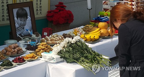 2016년 3월21일 오후 경기도 평택시 평택시립추모관에서 열린 신원영(7)군 49재 추모식에서 한 시민이 영정사진 속 원영이를 차마 보지 못한 채 눈물을 쏟고 있다[이미지출처=연합뉴스]