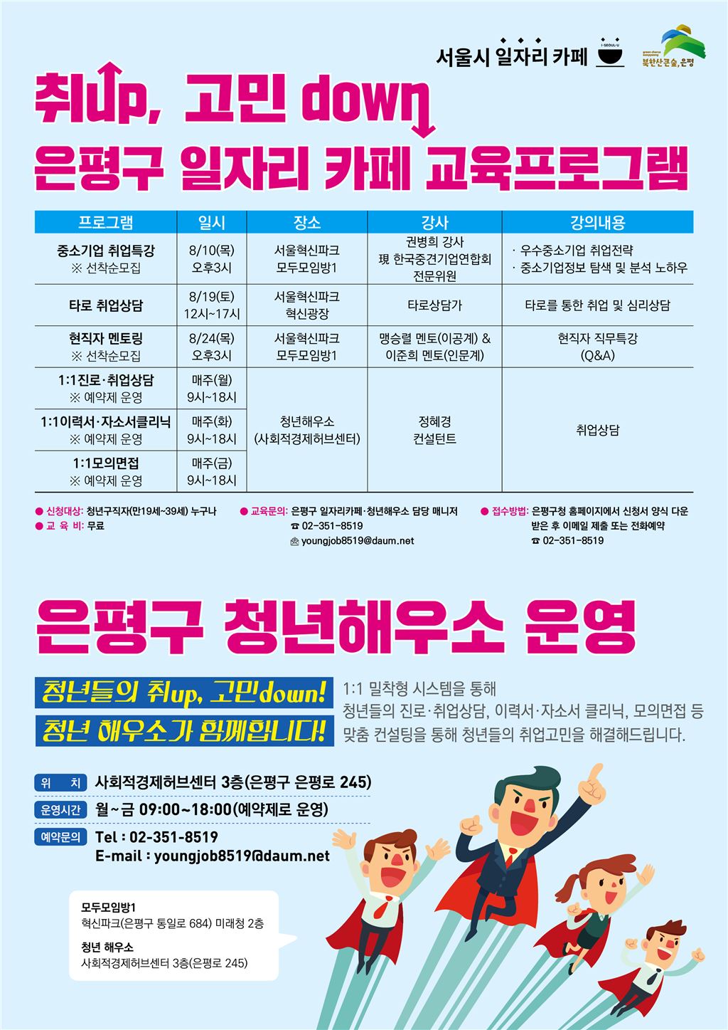 프로그램에 참여를 원하는 청년구직자는 은평구 홈페이지에서 신청서를 내려받아 이메일(youngjob8519@daum.net)로 제출하거나 전화(청년해우소 : 351-8519)로 신청이 가능하다.교육비는 무료다.구 관계자는 “이 프로그램을 통해 중소기업 취업에 대한 인식변화 및 청년들의 취업에 실질적인 도움이 되기를 바란다”며 “앞으로도 다양한 프로그램을 마련, 청년들 취업역량 강화를 위해 노력하겠다”고 말했다.박종일 기자 dream@asiae.co.kr<ⓒ세계를 보는 창 경제를 보는 눈, 아시아경제(www.asiae.co.kr) 무단전재 배포금지>
