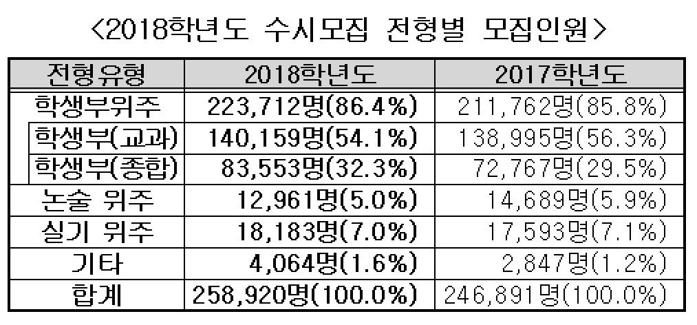 [아시아경제 조인경 기자] 올해 전국 4년제 대학의 입시에서 수시모집 비율이 74.0%로 역대 최대를 기록했다. 수시모집에서 학생부종합전형(학종)의 비율도 지난해보다 확대됐다.한국대학교육협의회(대교협)는 전국 197개 4년제 대학의 2018학년도 수시모집요강 주요사항을 19일 발표했다.2018학년도 대입에서 전체 모집인원은 2017학년도보다 244명 줄어든 24만9776명이다. 하지만 수시모집 인원은 전년도 24만6891명보다 많은 25만8920명으로 오히려 증가했다.이에 따라 전체 모집인원에서 수시모집인원의 비율도 2017학년도 70.5%에서 2018학년도에는74.0%로 무려 3.5%포인트 증가했다. 2년 전인 2016학년도 수시모집 비율은 67.4%였다.수시에서 학생부 위주 전형으로 선발하는 인원은 86.4%(22만3712명)로 2017학년도 85.8%(21만1762명)보다 0.6%포인트 늘어났다.