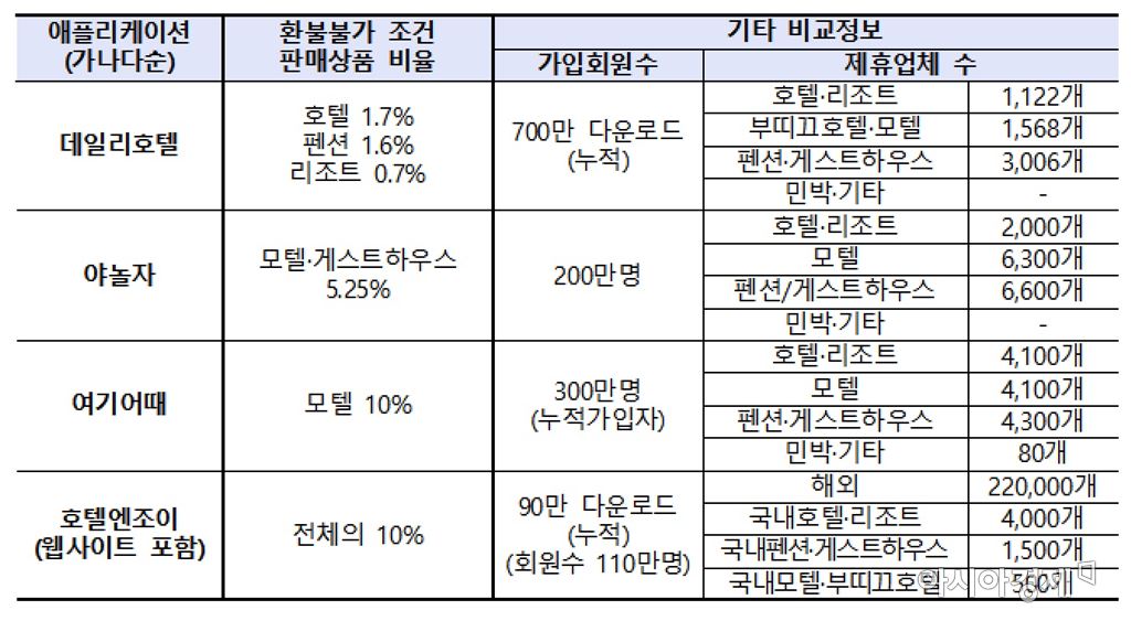 모바일 숙박예약 애플리케이션별 비교 정보(올해 5월 말 기준)<br />