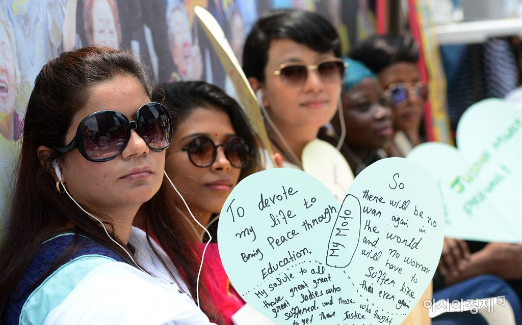 [아시아경제 문호남 기자] 이화여자대학교의 이화글로벌임파워먼트프로그램(Ewha Global Empowerment Program, EGEP) 참가차 한국에 머물고 있는 아시아·아프리카 각국 여성 운동가들이 19일 서울 종로구 옛 주한 일본대사관 앞 평화로에서 열린 제1292차 정기 수요시위에서 일본 정부의 공식 사죄를 촉구하는 손팻말을 들고 있다. 문호남 기자 munonam@asiae.co.kr<ⓒ세계를 보는 창 경제를 보는 눈, 아시아경제(www.asiae.co.kr) 무단전재 배포금지>