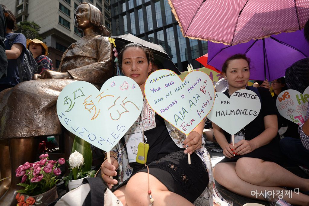 [아시아경제 문호남 기자] 이화여자대학교의 이화글로벌임파워먼트프로그램(Ewha Global Empowerment Program, EGEP) 참가차 한국에 머물고 있는 아시아·아프리카 각국 여성 운동가들이 19일 서울 종로구 옛 주한 일본대사관 앞 평화로에서 열린 제1292차 정기 수요시위에서 일본 정부의 공식 사죄를 촉구하는 손팻말을 들고 있다. 문호남 기자 munonam@asiae.co.kr<ⓒ세계를 보는 창 경제를 보는 눈, 아시아경제(www.asiae.co.kr) 무단전재 배포금지>