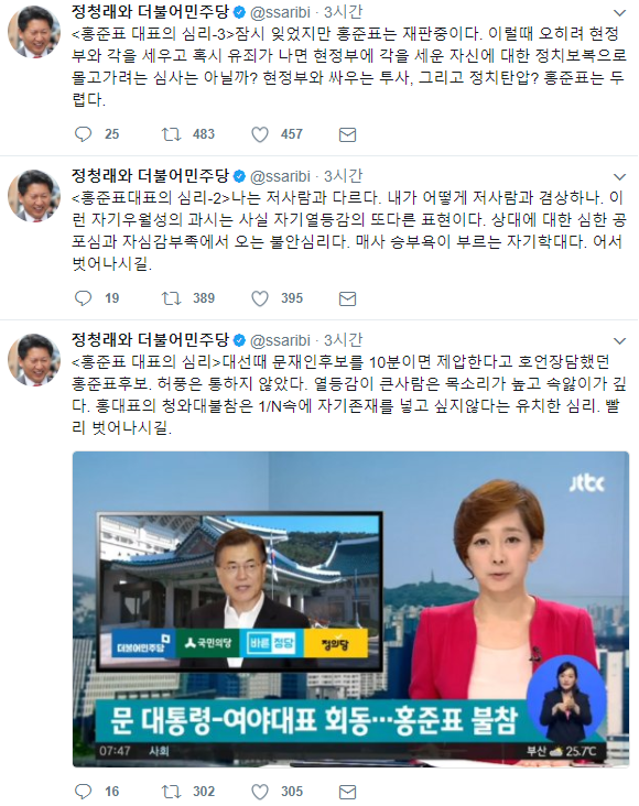 정청래 전 더불어민주당 의원이 19일 문재인 대통령이 여야 대표를 초청한 자리에 불참한 홍준표 자유한국당 대표에 대해 자기학대라며 어서 벗어나시길 바란다고 주장했다. 정 전 의원은 이날 자신의 트위터를 통해 청와대 초청에 응하지 않은 홍 대표의 태도는 “N 분의 1속에 자기 존재를 넣고 싶지 않다는 유치한 심리. 빨리 벗어나시길”라고 지적했다. 이어 “상대에 대한 공포심과 자신감 부족에서 오는 불안 심리다”라며 “매사 승부욕이 부르는 자기학대다. 어서 벗어나시길”이라고 말했다. 또 정 전 의원은 “잠시 잊었지만, 홍준표는 재판 중이다”며 “현 정부와 각을 세우고 혹시 유죄가 나면 현 정부에 각을 세운 자신에 대한 정치보복으로 몰고 가려는 심사는 아닐까? 현 정부와 싸우는 투사, 그리고 정치탄압? 홍준표는 두렵다”라고 우려했다. 한편, 홍 대표는 청주시 상당구 낭성면 수해 복구 현장을 찾아 “(문 대통령의) 들러리를 서지 않으려고 청와대 회동에 참석하지 않았다”고 밝히며 당직자들과 함께 산사태로 침수 피해를 본 농가에서 흙더미 치우기 등 봉사활동을 펼쳤다.<center><div class="slide_frame"><input type="hidden" id="slideIframeId" value="2016081609140181676A">
