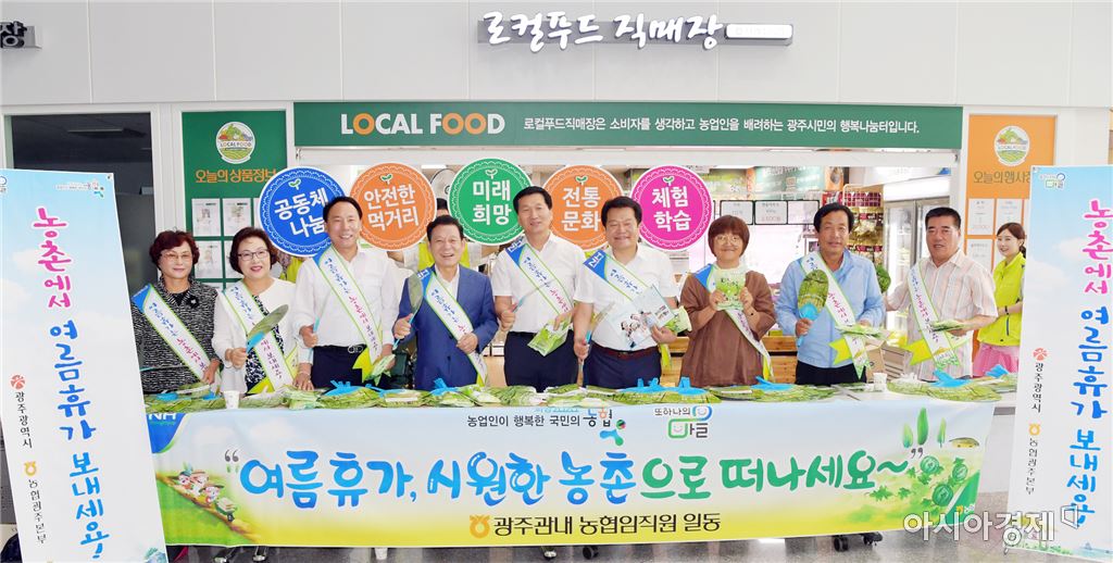 [아시아경제 노해섭 기자]윤장현 광주광역시장이 20일 오전 시청 1층 로컬푸드 매장 앞에서 열린 '여름휴가 농촌에서 보내기' 캠페인에 참여해 광주 관내 농협임직원들과 함께 출근하는 시 직원들에게 쌀과 부채를 나눠준 뒤 기념촬영을 하고 있다.