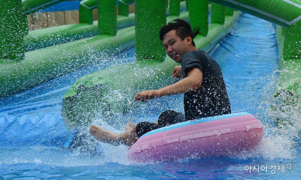 [아시아경제 문호남 기자] 연일 폭염이 이어지고 있는 21일 서울 여의도 한강시민공원을 찾은 한 시민이 워터슬라이드를 타며 더위를 식히고 있다.문호남 기자 munonam@asiae.co.kr<ⓒ세계를 보는 창 경제를 보는 눈, 아시아경제(www.asiae.co.kr) 무단전재 배포금지>
