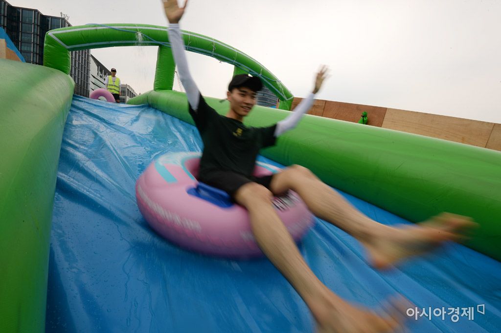[아시아경제 문호남 기자] 연일 폭염이 이어지고 있는 21일 서울 여의도 한강시민공원을 찾은 한 시민이 워터슬라이드를 타며 더위를 식히고 있다.문호남 기자 munonam@asiae.co.kr<ⓒ세계를 보는 창 경제를 보는 눈, 아시아경제(www.asiae.co.kr) 무단전재 배포금지>