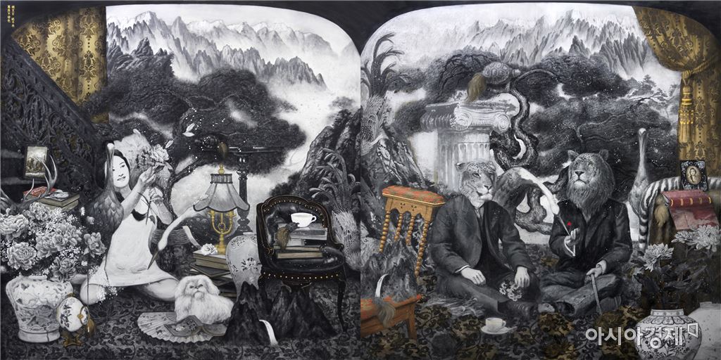 [아시아경제 김세영 기자] 성북구립미술관은 내달 27일까지 제 1, 2전시실에서 2017 여름 프로젝트로 ‘밤보다 긴 꿈: 라오미’전(매주 월요일 휴관·무료)을 연다. 전시에는 동·서양 고전, 신화와 전설, 설화 속에 등장하는 상징적 도상과 알레고리를 통해 인간의 보편적 욕망을 표현해온 라오미 작가의 신작이 공개된다. 작가는 최근 새롭게 시도한 ‘사진관 프로젝트’시리즈와 더불어 한국의 근현대 공간과 스토리, 잡지, 북한 설화 등을 재해석한 작품 등 총 스무 점을 내놓았다. 라오미의 신작 ‘라이거와 타이곤의 초상’(2017)은 근현대 사진 속 배경으로 등장하는 산수화나 불로장생과 같은 욕망을 상징하는 대상을 통해 이상화된 현실 풍경을 표현한다. 특히, 스테레오 카메라(동시에 두 장의 이미지를 얻을 수 있는 특수카메라)를 주로 사용했던 근대 사진들처럼 하나로 풍경으로 연결된 작품 두 점으로 제작됐으며, 이를 작품 앞에 놓여진 스테레오 뷰어를 통해 보면 두 개의 화면이 접힌 듯 겹쳐져 또 다른 풍경을 볼 수 있다. ‘접힌 풍경, 심우장’(2017)도 같은 표현 방식이다. 성북 지역의 근현대 역사와 인물을 상징하는 도상들을 나타냈다. 대칭 구도로 분리된 공간 속에 여러 이미지들이 중첩된다. 이외에도 우주 공간을 배경으로 동·서양의 도상적 이미지로 구성된 ‘화성별곡’(2017), 한국 근대잡지 이미지를 차용한 ‘별건곤(別乾坤)’(2017) 등을 새롭게 선보인다.화성별곡 Mars Fantasia_2017_장구가죽에 금박, 아크릴_42.5x42.5cm