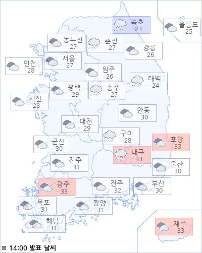 현재 기온이 가장 낮은 곳은 속초로 영상 23도이며, 포항은 영상 33도로 가장 높은 기온을 기록하고 있고, 아침 최저기온은 영상 22도에서 영상 28도, 낮 최고기온은 영상 27도에서 영상 37도가 되겠습니다.미세먼지 농도: 오후 전국적으로 ‘보통’ 입니다.※ 미세먼지 자료는 인증되지 않은 실시간 자료이므로 오차가 발생할수 있음.아경봇 기자 r2@asiae.co.kr<ⓒ세계를 보는 창 경제를 보는 눈, 아시아경제(www.asiae.co.kr) 무단전재 배포금지>