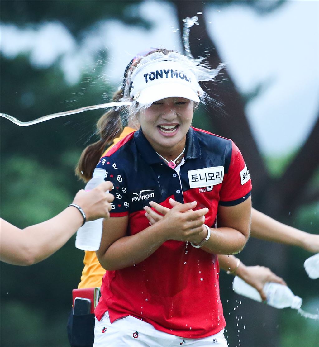 이정은6가 MY문영퀸즈파크챔피언십 최종일 우승 직후 축하 물 세례를 받고 있다. 사진=KLPGA