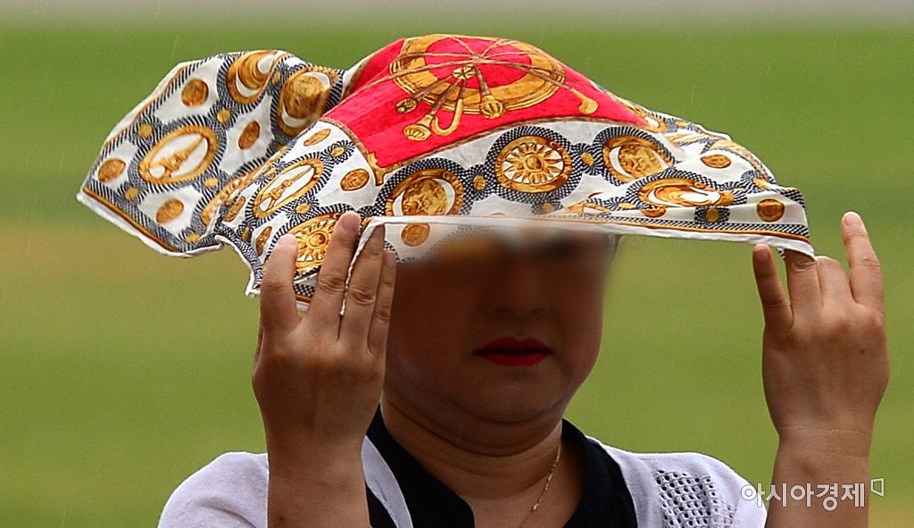 [아시아경제 문호남 기자] 중부지방에 장맛비가 예보된 24일 서울 중구 서울광장에서 한 시민이 스카프로 소나기를 피하고 있다. 문호남 기자 munonam@asiae.co.kr<ⓒ세계를 보는 창 경제를 보는 눈, 아시아경제(www.asiae.co.kr) 무단전재 배포금지>