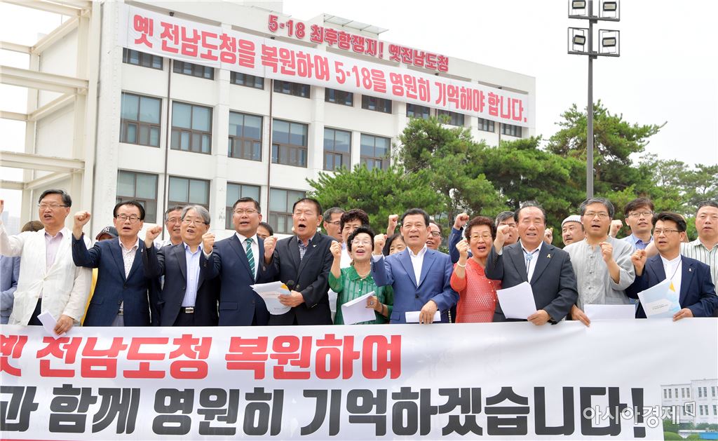 [아시아경제 노해섭 기자]윤장현 광주광역시장이 24일 오전 동구 금남로 옛 전남도청 별관에서 열린 도종환 문체부장관 면담을 위한 범시도민대책위원회 6차 위원장단 회의에 참석한 뒤 기자회견을 열고 이철우 대책위 상임위원장, 장휘국 광주시교육감, 이은방 광주시의회 의장, 5월 단체 대표 등 참석자들과 옛 도청 원형 보존을 촉구하고 있다./광주광역시 제공<ⓒ세계를 보는 창 경제를 보는 눈, 아시아경제(www.asiae.co.kr) 무단전재 배포금지>