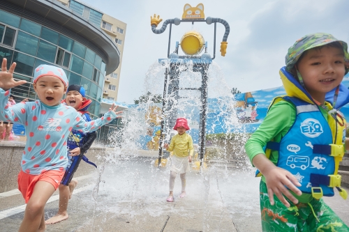 [ 경주 뽀로로 아쿠아 빌리지의 '로디의 버킷 놀이'에서 아이들이 뛰어놀고 있다]