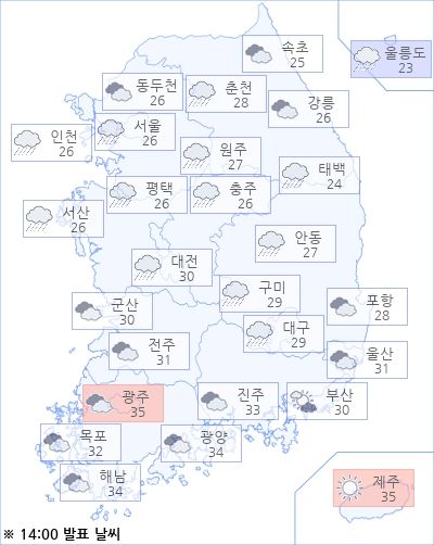 현재 기온이 가장 낮은 곳은 울릉도로 영상 23도이며, 광주는 영상 35도로 가장 높은 기온을 기록하고 있고, 아침 최저기온은 영상 22도에서 영상 28도, 낮 최고기온은 영상 27도에서 영상 35도가 되겠습니다.미세먼지 농도: 오후 경북·경남·제주·충청도·전라도·수도권 지방은 ‘보통’ 입니다.※ 미세먼지 자료는 인증되지 않은 실시간 자료이므로 오차가 발생할수 있음.아경봇 기자 r2@asiae.co.kr<ⓒ세계를 보는 창 경제를 보는 눈, 아시아경제(www.asiae.co.kr) 무단전재 배포금지>