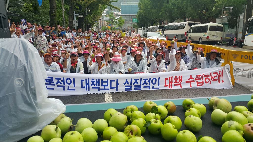 24일 오후 청와대 앞길에서 농민들이 우박을 맞아 피해를 본 영주사과를 앞에 두고 현행 재해보험법 개정을 촉구하는 구호를 외치고 있다. 사진=이관주기자