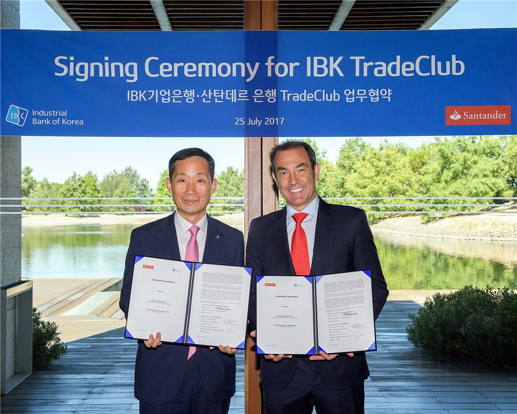 25일(현지시간) 스페인 산탄데르은행 본사에서 배관희 기업은행 외환사업부 부장(왼쪽)과 페르난도(Fernando Lardies) 산탄데르은행 부행장이 협약식을 마치고 기념 촬영을 하고 있다. (사진 : 기업은행)