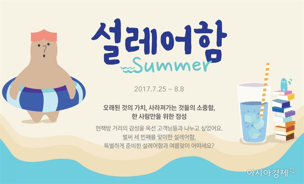 [아시아경제 오종탁 기자] 온라인 쇼핑몰 옥션이 도서 큐레이팅 서비스를 진행한다.옥션은 내달 8일까지 2040 고객들을 위한 맞춤형 도서 추천 프로모션 '설레어함-여름'을 진행한다고 26일 밝혔다.지난해 11월 첫 선을 보인 설레어함은 고객 취향에 맞춰 도서를 추천해 주는 옥션의 도서 큐레이션 서비스다. 청계천 헌책방 거리가 사라지는 것을 아쉬워한 대학생들이 낸 아이디어에서 시작됐다. 서울 청계천 소재 헌책방 주인들이 직접 고객이 선택한 주제에 맞춰 총 3권의 도서를 골라 무료로 배송해 준다.이번 프로모션은 지난 4월 진행했던 '벚꽃 그리고 설레어함'에 이어 세 번째로 마련된 시리즈다. 주제에 맞춘 헌 책 3권과 여름 특별 선물로 구성된 단독 패키지를 1만5000원에 500개 한정 판매한다.오종탁 기자 tak@asiae.co.kr<ⓒ세계를 보는 창 경제를 보는 눈, 아시아경제(www.asiae.co.kr) 무단전재 배포금지>