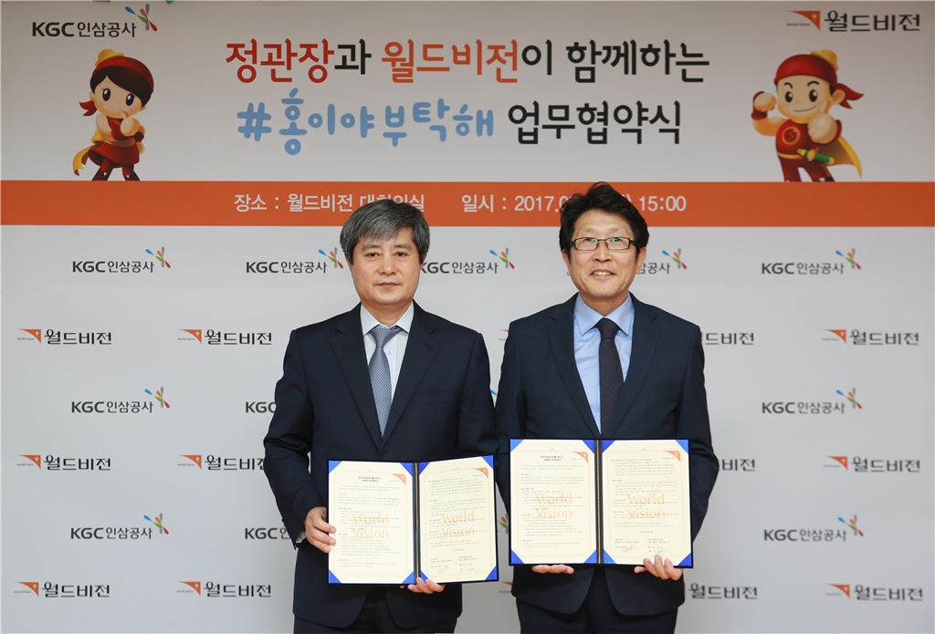25일 서울 여의도 월드비전 빌딩에서 KGC인삼공사 박정환 국내사업본부장(왼쪽)과 월드비전 어호선 마케팅부문장이 아프리카 식수위생사업 후원 협약을 체결하고 사진을 찍고 있다.